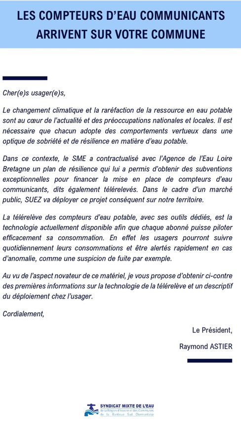La télérelève assure un suivi précis de la consommation d’eau, en vue non seulement de faire des économies, mais également de vous accompagner vers plus de sobriété. Elle permet de détecter les fuites potentielles dans les conduites et d’agir rapidement. Ce dispositif est soutenu financièrement par l’agence de l’eau Loire-Bretagne.