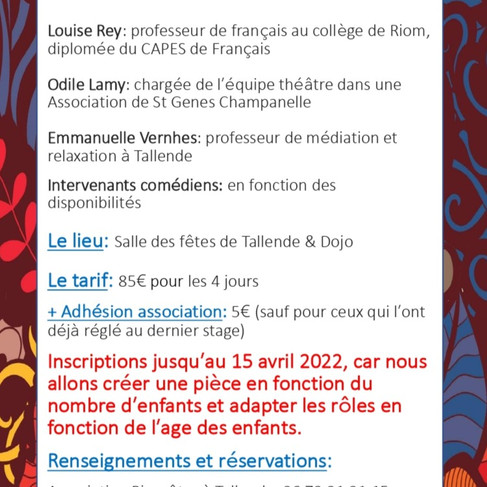 L'Association Bien être à Tallende propose un stage de théâtre pour les enfants du CP à la 6ème du 26 au 29 avril, de 9h à 16h. En fonction du nombre et de l'âge des enfants, une pièce sera créée.