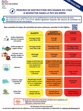 Au regard de cette situation, le préfet a signé l'arrêté n° 20251541 en date du 16 septembre 2025 instaurant les mesures de restriction des usages de l'eau dans le Puy-de-Dôme applicables le 17 septembre 2025. Il abroge l'arrêté préfectoral n° 20251482 du 5 septembre 2025.